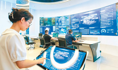 浙江迎丰科技股份有限公司的技术人员通过“织造印染产业大脑”进行生产数据实时监测分析。高 洁摄