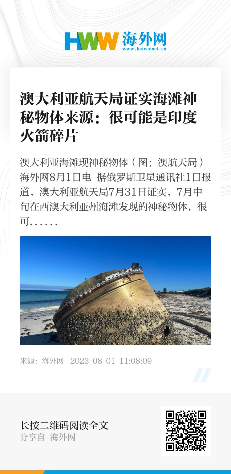 澳航天局通过社交平台推特发声:“经过调查,官员们得出结论,位于西澳大利亚州海滩的物体,很可能是极地卫星运载火箭的碎片。这些碎片与印度空间研究组织运营的运载火箭有关。”