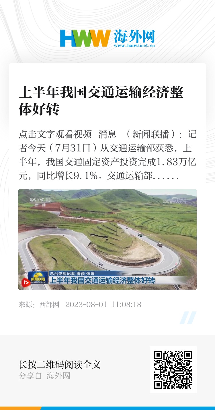 央视网消息(新闻联播):记者今天(7月31日)从交通运输部获悉,上半年,我国交通固定资产投资完成1.83万亿元,同比增长9.1%。交通运输部和财政部累计安排中央车购税资金3049.4亿元支持地方公路水路建设,带动交通项目加快建设,并加强对交通强国重大工程、国家公路省级瓶颈路段、川藏铁路配套公路等重点项目跟踪指导和督促协调,保障项目顺利实施。