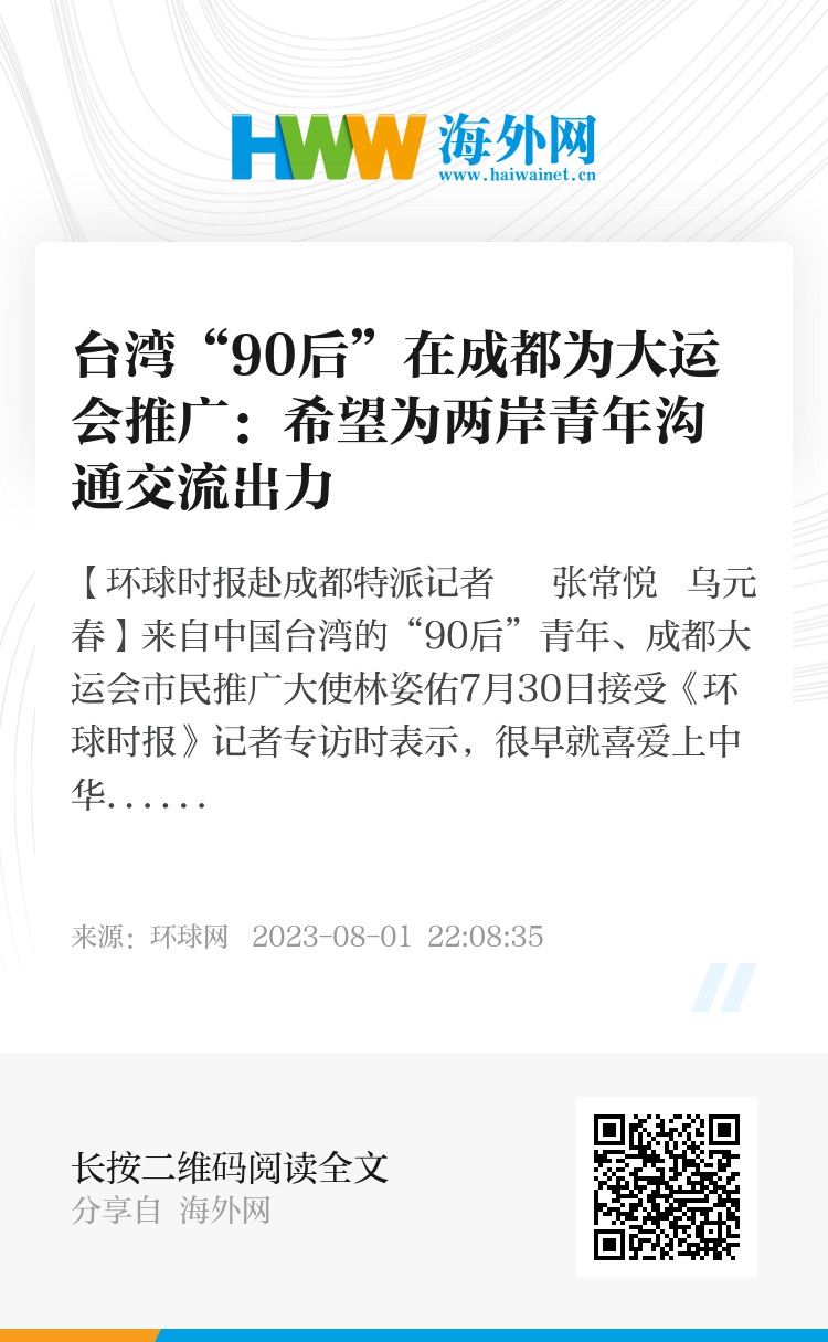 【环球时报赴成都特派记者 张常悦 乌元春】来自中国台湾的“90后”青年、成都大运会市民推广大使林姿佑7月30日接受《环球时报》记者专访时表示,很早就喜爱上中华优秀传统文化,十分荣幸能够成为成都大运会市民推广大使,她希望借此机会能为成都大运会的文化宣传、为两岸青年深入沟通交流贡献自己的力量,这次看到中国台北大学生运动员来到大陆为家乡争光,十分感动。