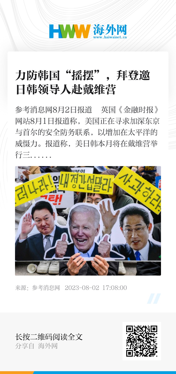 报道称,美日韩本月将在戴维营举行三边领导人会议。美国表示,希望日本和韩国同意,在发生袭击的情况下,每一方都有义务与其他方进行磋商。华盛顿还力促发表“具有历史意义的联合声明”。