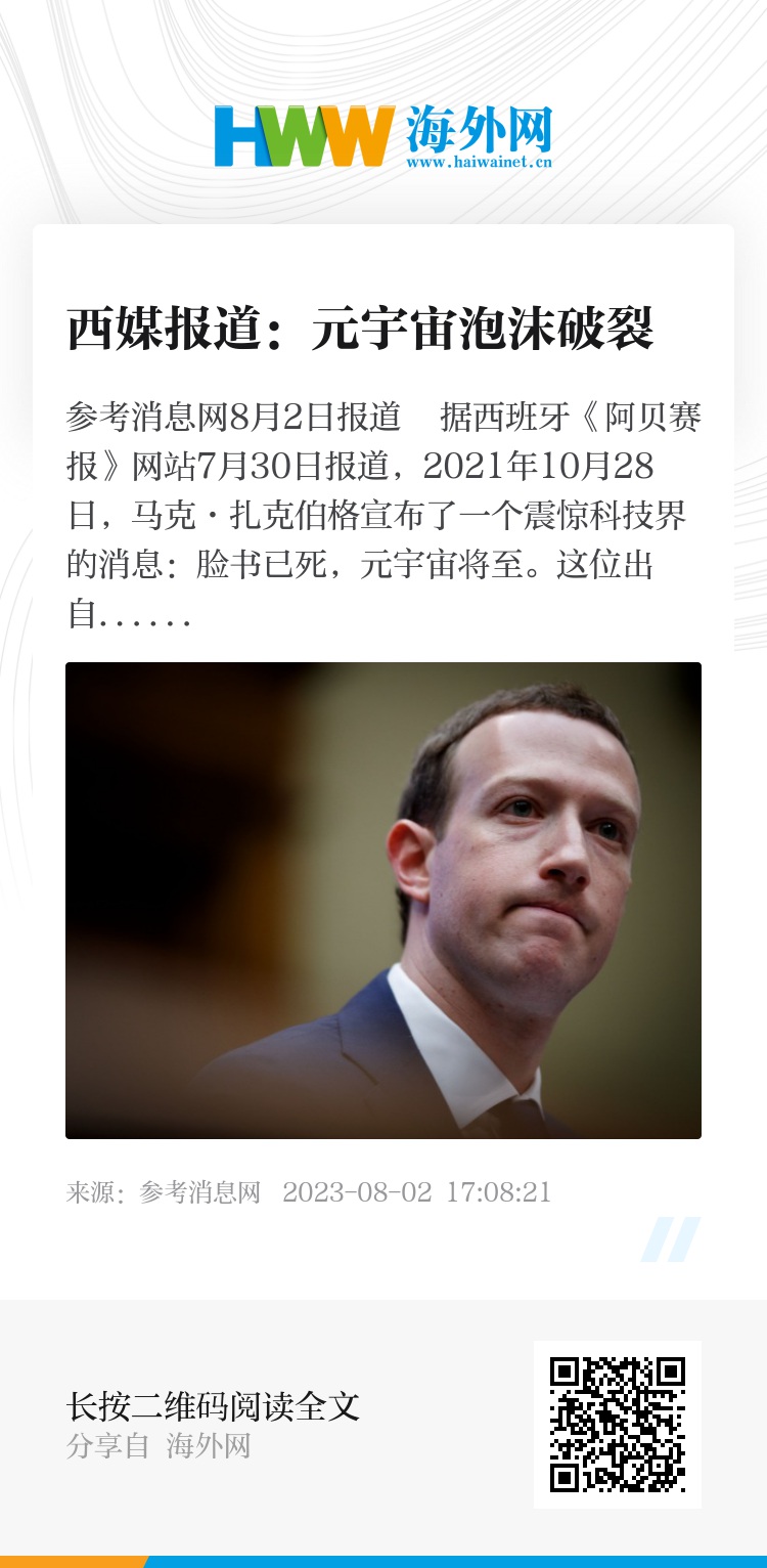 参考消息网8月2日报道 据西班牙《阿贝赛报》网站7月30日报道,2021年10月28日,马克·扎克伯格宣布了一个震惊科技界的消息:脸书已死,元宇宙将至。这位出自哈佛大学的天才舍弃了他的旗舰品牌,进入了元宇宙时代。