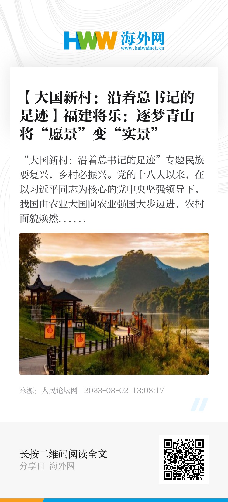 党的二十大报告指出,“全面建设社会主义现代化国家,最艰巨最繁重的任务仍然在农村。坚持农业农村优先发展,坚持城乡融合发展,畅通城乡要素流动。加快建设农业强国,扎实推动乡村产业、人才、文化、生态、组织振兴。”人民论坛网推出“大国新村:沿着总书记的足迹”系列报道,讲好神州大地广袤乡村的振兴故事。今天,人民论坛调研组带您走进福建省三明市将乐县,一起感受这座灵山秀水之城把“蓝图”变“现实”、将“愿景”化“实景”的乡村振兴路。
