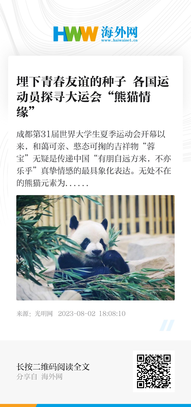 成都第31届世界大学生夏季运动会开幕以来,和蔼可亲、憨态可掬的吉祥物“蓉宝”无疑是传递中国“有朋自远方来,不亦乐乎”真挚情感的最具象化表达。无处不在的熊猫元素为世界各国和地区的运动员带来了欢乐和惊喜,同时也埋下了青春友谊的种子。