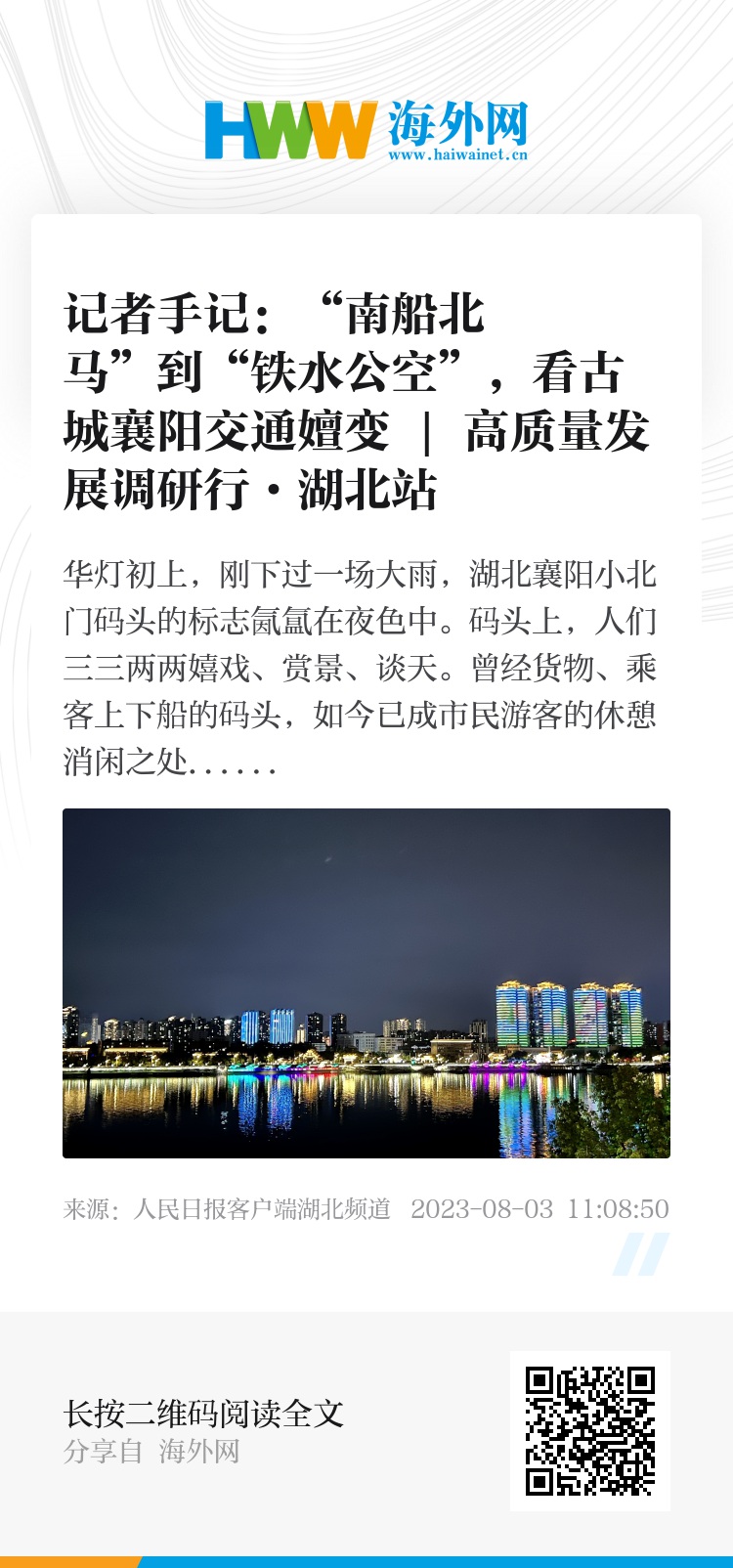 乘车离开襄阳,道路平整宽阔,货车往来穿梭,不时可以看到内环高架桥建设的火热场景,“一轴三环九放射”的内畅外快城市路网正在形成。汉江穿城而过,静静流淌,古老的“黄金水道”和现代的立体交通网络穿越时空相遇,见证着一个日新月异的襄阳。(郭雪岩)