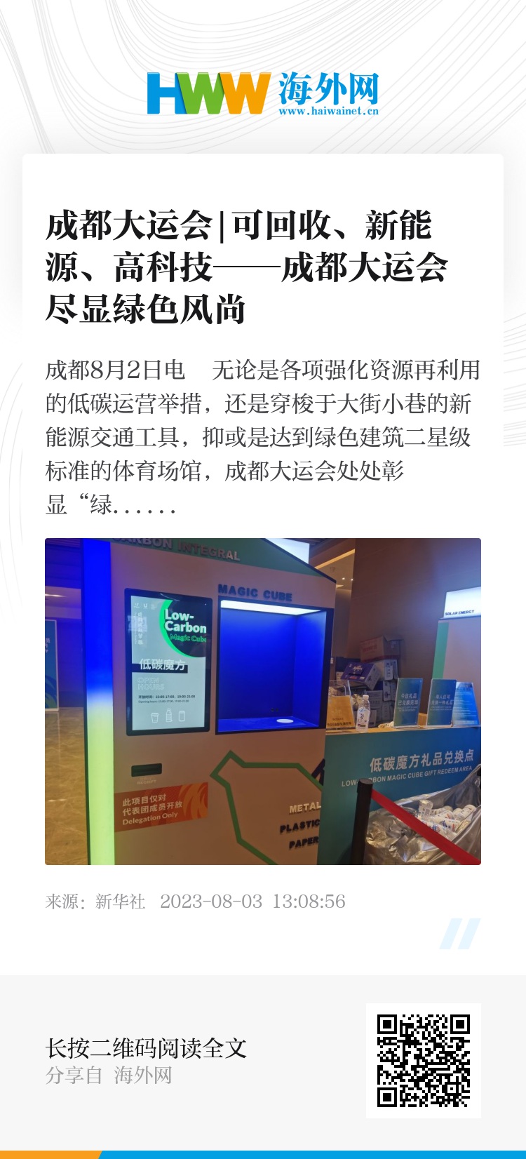 新华社成都8月2日电 无论是各项强化资源再利用的低碳运营举措,还是穿梭于大街小巷的新能源交通工具,抑或是达到绿色建筑二星级标准的体育场馆,成都大运会处处彰显“绿色、智慧、活力、共享”的办赛理念。