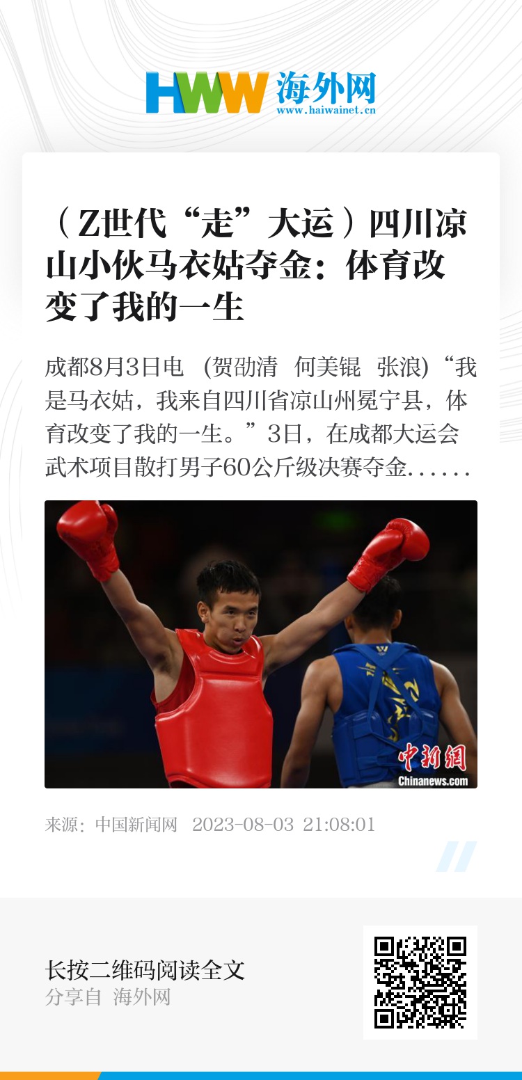 中新网成都8月3日电 (贺劭清 何美锟 张浪)“我是马衣姑,我来自四川省凉山州冕宁县,体育改变了我的一生。”3日,在成都大运会武术项目散打男子60公斤级决赛夺金后,中国彝族选手马衣姑告诉中新网记者,接下来自己的目标是世锦赛、亚运会,让体育带他看更多的世界。