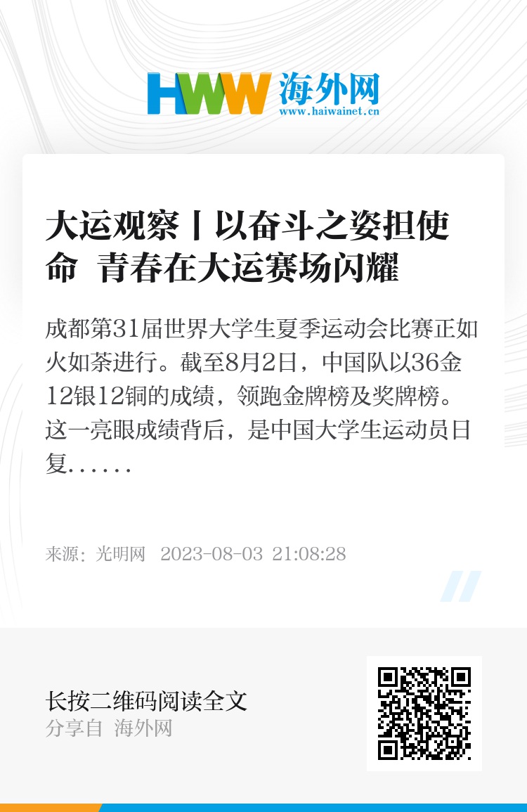 成都第31届世界大学生夏季运动会比赛正如火如荼进行。截至8月2日,中国队以36金12银12铜的成绩,领跑金牌榜及奖牌榜。这一亮眼成绩背后,是中国大学生运动员日复一日、持之以恒、艰苦卓绝的训练,更是中国青年在大运赛场不畏对手、敢打敢拼、奋勇争先的顽强意志和卓越精神。