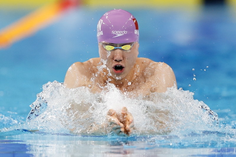 图为覃海洋在成都大运会男子100米蛙泳比赛中