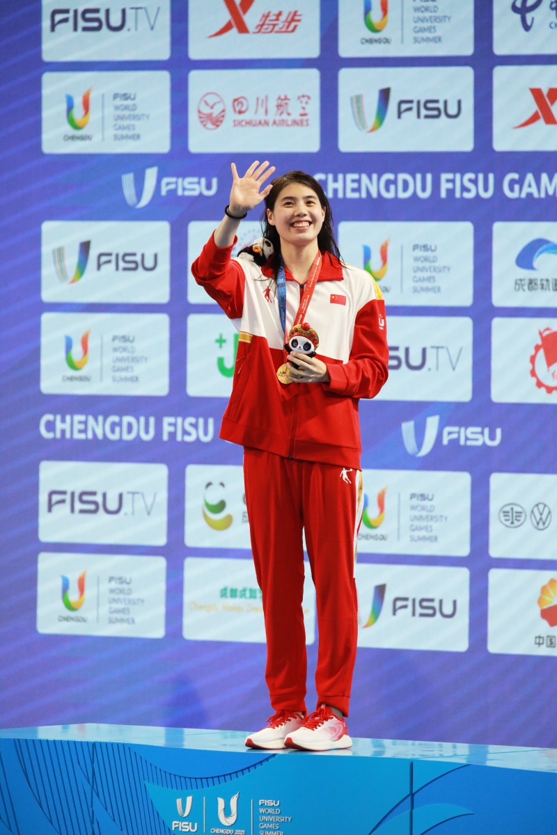 图为张雨菲获得成都大运会50米蝶泳金牌
