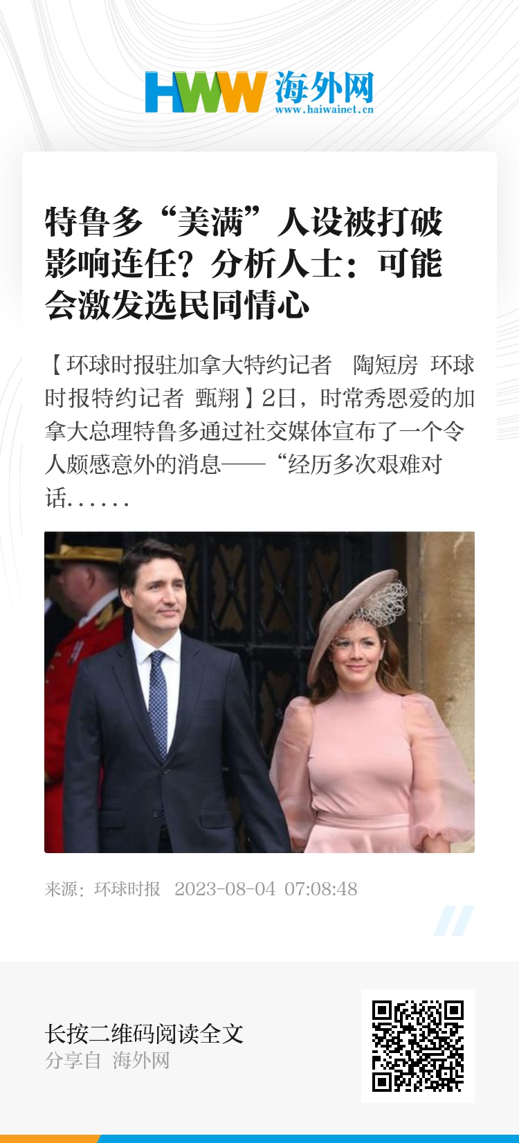 【环球时报驻加拿大特约记者 陶短房 环球时报特约记者 甄翔】2日,时常秀恩爱的加拿大总理特鲁多通过社交媒体宣布了一个令人颇感意外的消息——“经历多次艰难对话后”,他与结婚18年的妻子索菲·格雷瓜尔·特鲁多正式分居。加总理办公室确认,总理夫妇已经签署合法分居协议,但强调特鲁多一家仍很“亲密”,夫妻二人将努力让孩子们“在安全、有爱而和谐的环境中成长”,父母双方都会一直陪伴孩子们生活,特鲁多一家下周就将开始一起休假。