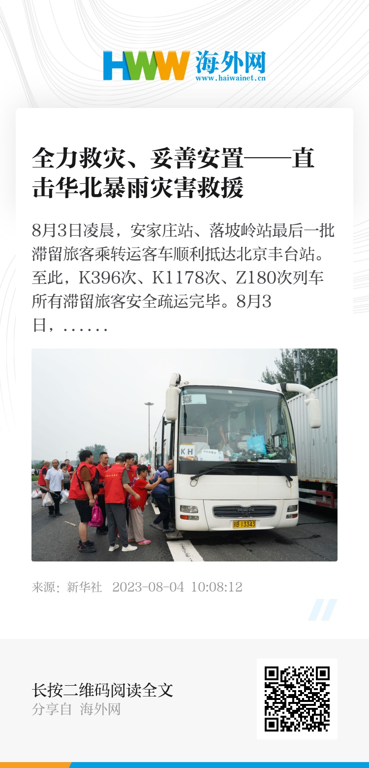 8月3日凌晨,安家庄站、落坡岭站最后一批滞留旅客乘转运客车顺利抵达北京丰台站。至此,K396次、K1178次、Z180次列车所有滞留旅客安全疏运完毕。