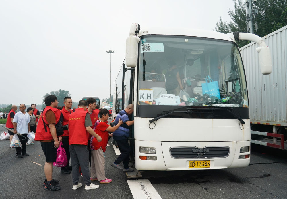 8月2日,在北京市房山区的京港澳高速琉璃河出口,受灾群众有序登上转运车辆。新华社记者任超 摄