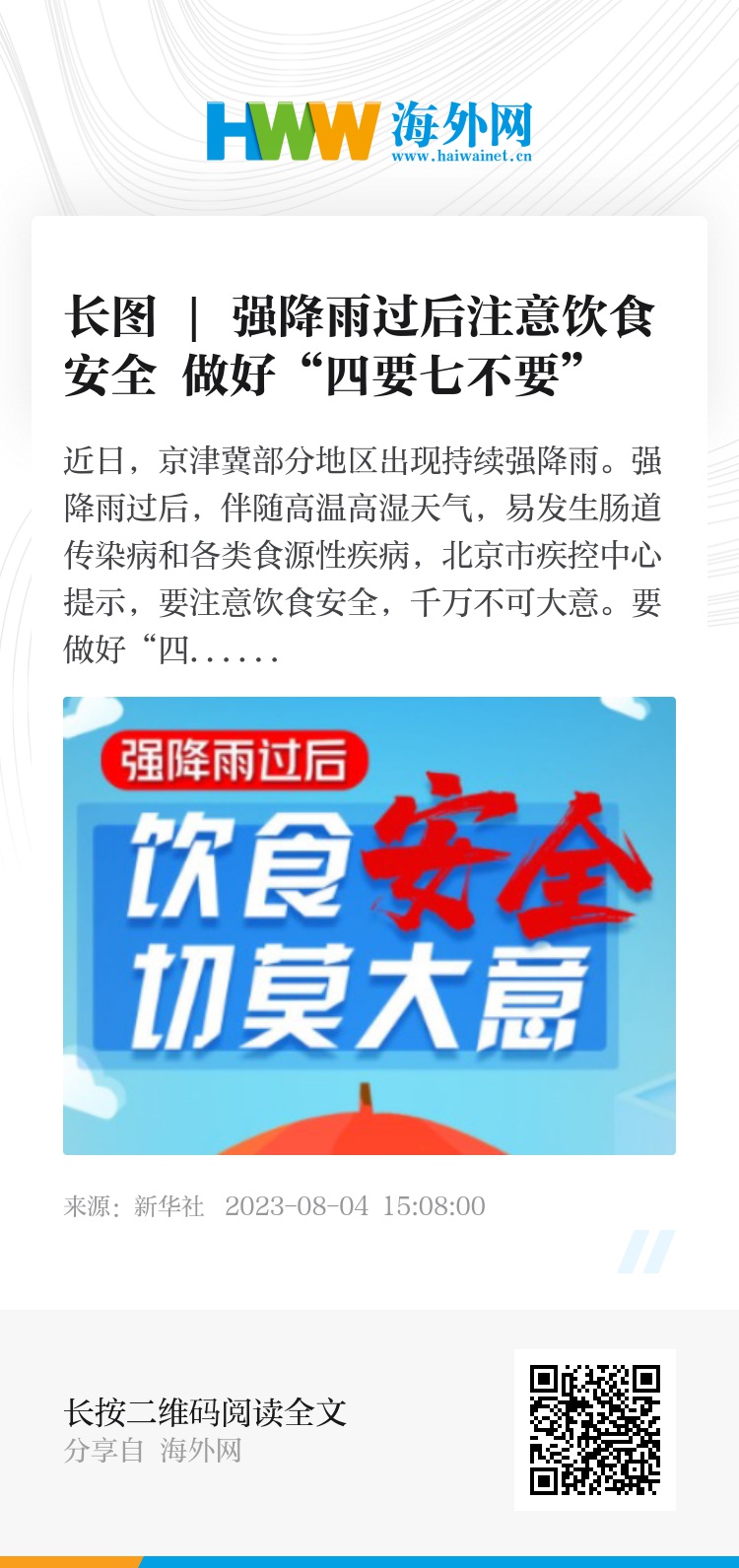 近日,京津冀部分地区出现持续强降雨。强降雨过后,伴随高温高湿天气,易发生肠道传染病和各类食源性疾病,北京市疾控中心提示,要注意饮食安全,千万不可大意。要做好“四要七不要”,严防“病从口入”!