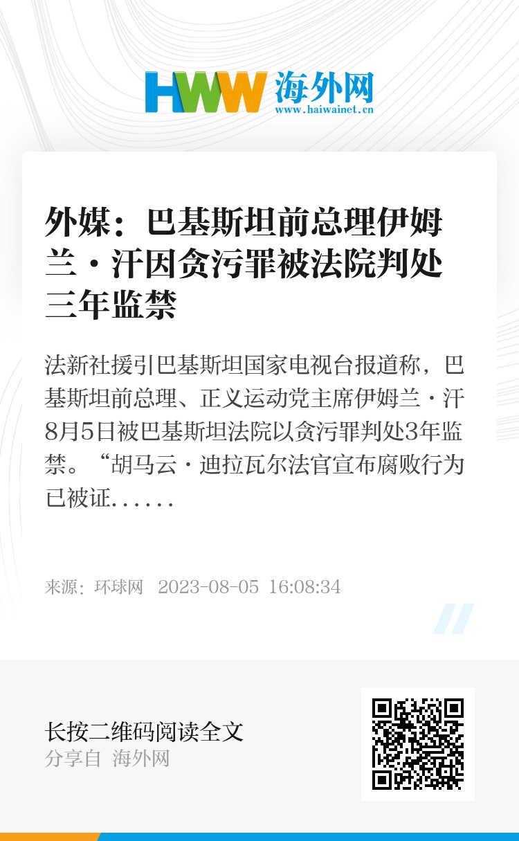 “胡马云·迪拉瓦尔法官宣布腐败行为已被证实,”巴基斯坦国家电视台称。另据法新社报道,伊姆兰·汗本人没有出席审判。