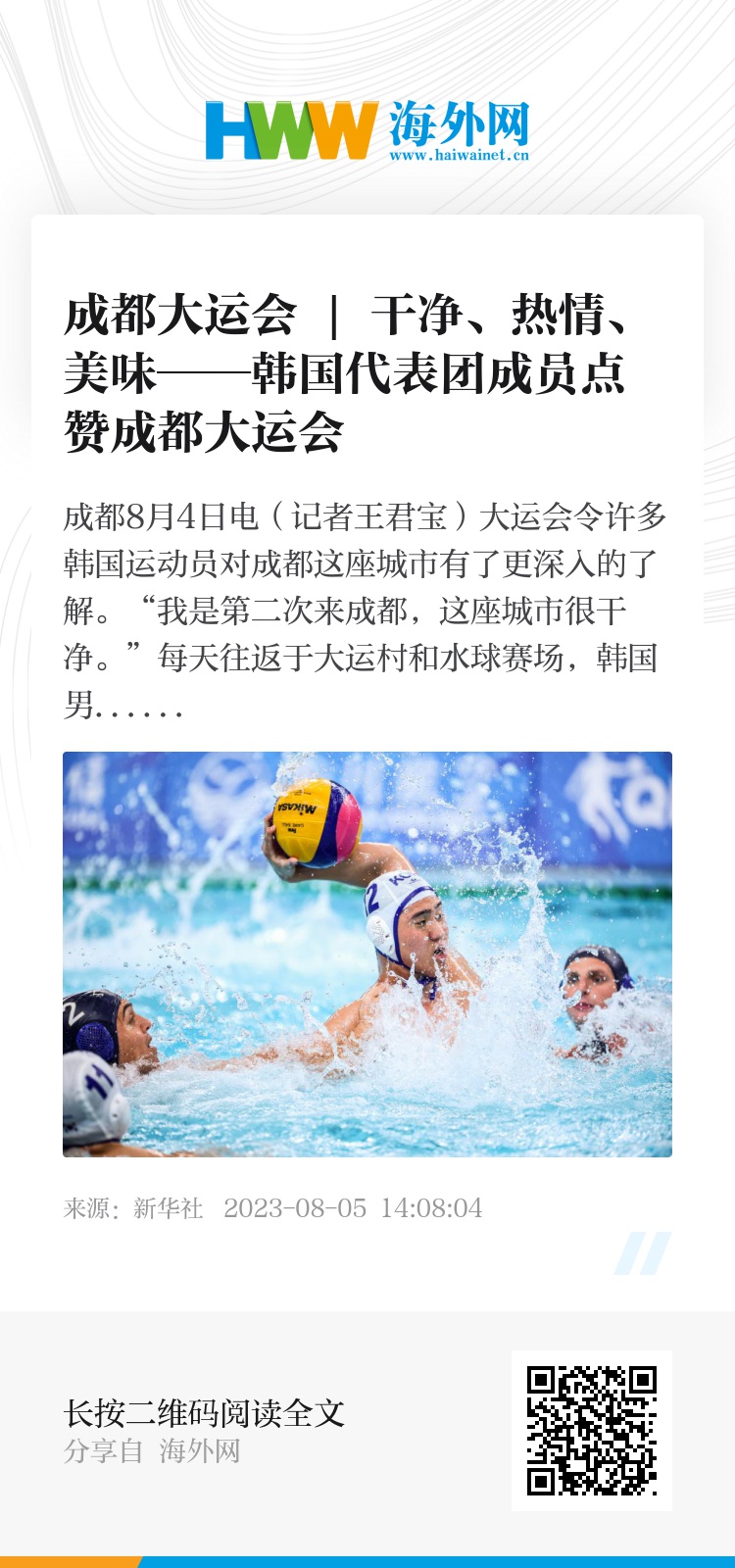 “我是第二次来成都,这座城市很干净。”每天往返于大运村和水球赛场,韩国男子水球队的助理教练崔康鎭说,他能从每天几十公里的路程中,看到这座城市的绿化和环境。