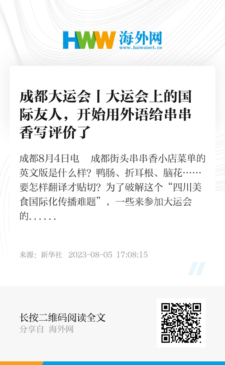 新华社成都8月4日电 成都街头串串香小店菜单的英文版是什么样?鸭肠、折耳根、脑花……要怎样翻译才贴切?为了破解这个“四川美食国际化传播难题”,一些来参加大运会的外国友人贡献出了宝贵经验。