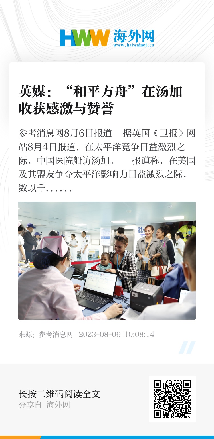 报道称,在美国及其盟友争夺太平洋影响力日益激烈之际,数以千计的汤加人前往停靠在首都港口的一艘中国海军医院船上求医问药,他们对北京提供的免费医疗服务称赞不已。