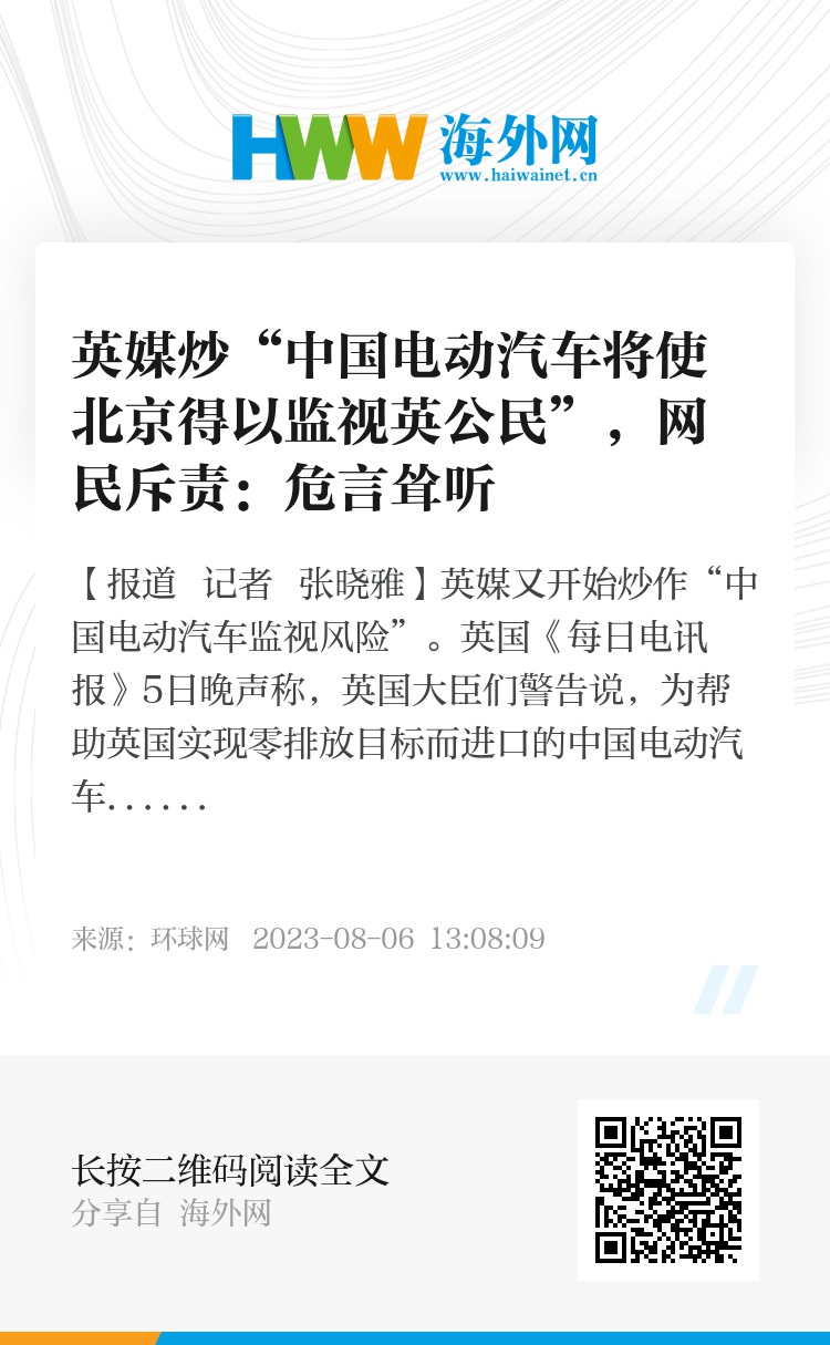 与此同时,报道继续渲染称,一个跨党派议员小组也警告政府,英国正准备将其汽车市场的“关键基础设施”控制权拱手让给北京,并“带来所有随之而来的安全风险”,为此他们敦促英政府采取行动。《每日电讯报》还借英政府消息人士和大臣的所谓担忧,一再渲染“中国进行间谍活动” 。