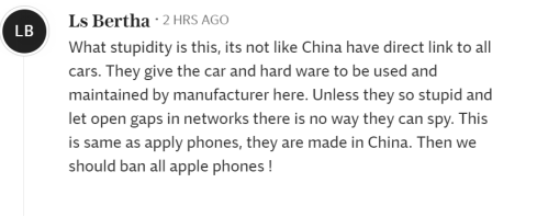 “这是多么愚蠢啊,中国又不是和所有汽车都有直接联系。他们把汽车和硬件交给这里的制造商使用和维护。除非他们蠢到让网络出现漏洞,否则他们不可能进行间谍活动。这和苹果手机一样,都是中国制造的。那么我们应该禁止所有苹果手机!”