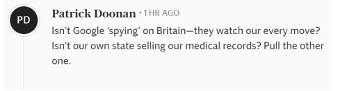 还有网友提到美国互联网巨头公司,“谷歌不是在‘监视’英国吗——他们监视着我们的一举一动?我们自己的地区不是在卖我们的医疗记录吗?”