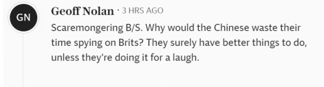 “危言耸听。中国人为什么要浪费时间监视英国人?他们肯定有更好的事情要做,除非他们这么做是为了搞笑。”