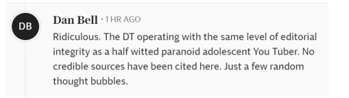 “荒谬。《每日电讯报》编辑诚信水平与一个愚笨的、患妄想症的青春期You Tube博主一样。这里没有引用可信的消息来源。只有一些随机的思想泡沫。”