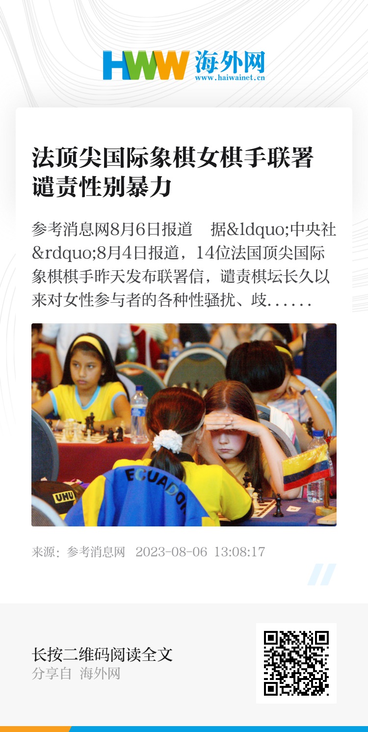 参考消息网8月6日报道 据“中央社”8月4日报道,14位法国顶尖国际象棋棋手昨天发布联署信,谴责棋坛长久以来对女性参与者的各种性骚扰、歧视与性别暴力,随即获数十位国际知名棋手加入,同声谴责断送许多女棋手职业生涯的棋坛陋习。