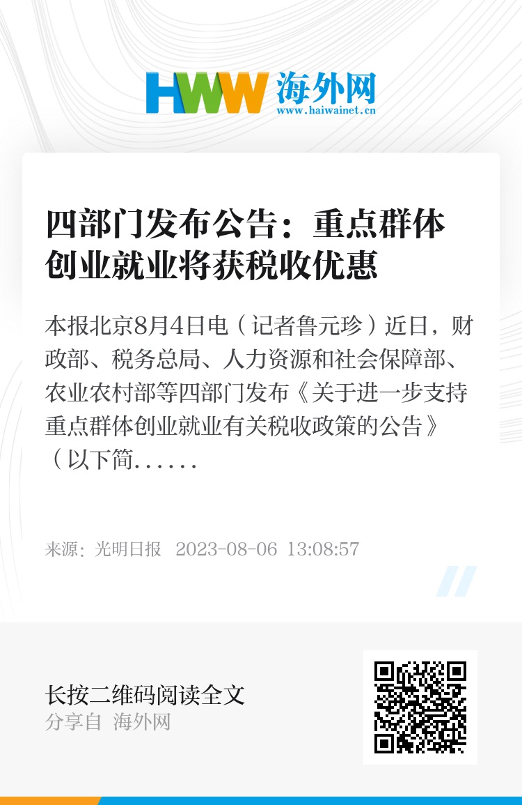 本报北京8月4日电(记者鲁元珍)近日,财政部、税务总局、人力资源和社会保障部、农业农村部等四部门发布《关于进一步支持重点群体创业就业有关税收政策的公告》(以下简称《公告》),进一步支持重点群体创业就业。