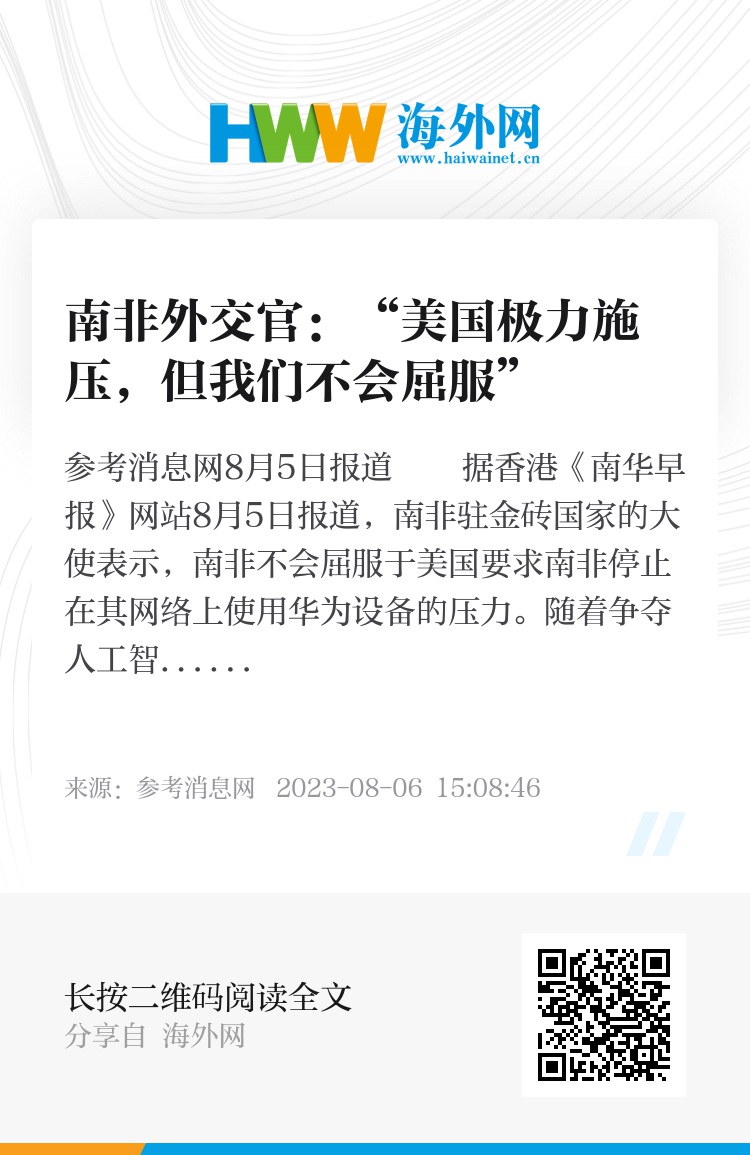 参考消息网8月5日报道 据香港《南华早报》网站8月5日报道,南非驻金砖国家的大使表示,南非不会屈服于美国要求南非停止在其网络上使用华为设备的压力。