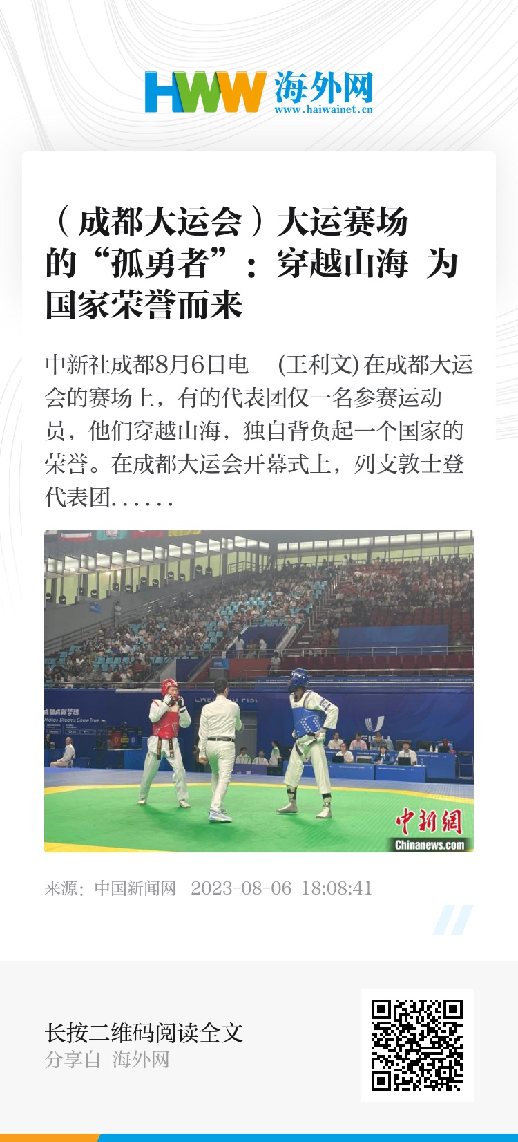 中新社成都8月6日电 (王利文)在成都大运会的赛场上,有的代表团仅一名参赛运动员,他们穿越山海,独自背负起一个国家的荣誉。