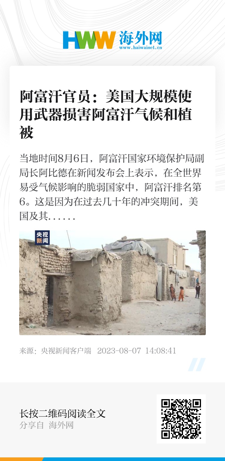 当地时间8月6日,阿富汗国家环境保护局副局长阿比德在新闻发布会上表示,在全世界易受气候影响的脆弱国家中,阿富汗排名第6。这是因为在过去几十年的冲突期间,美国及其盟友在阿富汗使用了大量武器弹药,损害了阿富汗的气候和植被。