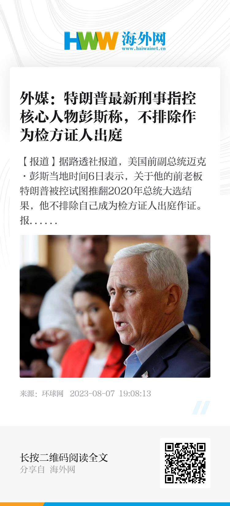 【环球网报道】据路透社报道,美国前副总统迈克·彭斯当地时间6日表示,关于他的前老板特朗普被控试图推翻2020年总统大选结果,他不排除自己成为检方证人出庭作证。报道称,彭斯成为特朗普最新刑事指控中的核心人物。