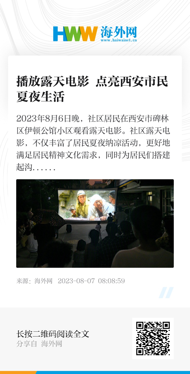2023年8月6日晚,社区居民在西安市碑林区伊顿公馆小区观看露天电影。社区露天电影,不仅丰富了居民夏夜纳凉活动,更好地满足居民精神文化需求,同时为居民们搭建起沟通交流的桥梁,加深邻里感情。图源:IC photo