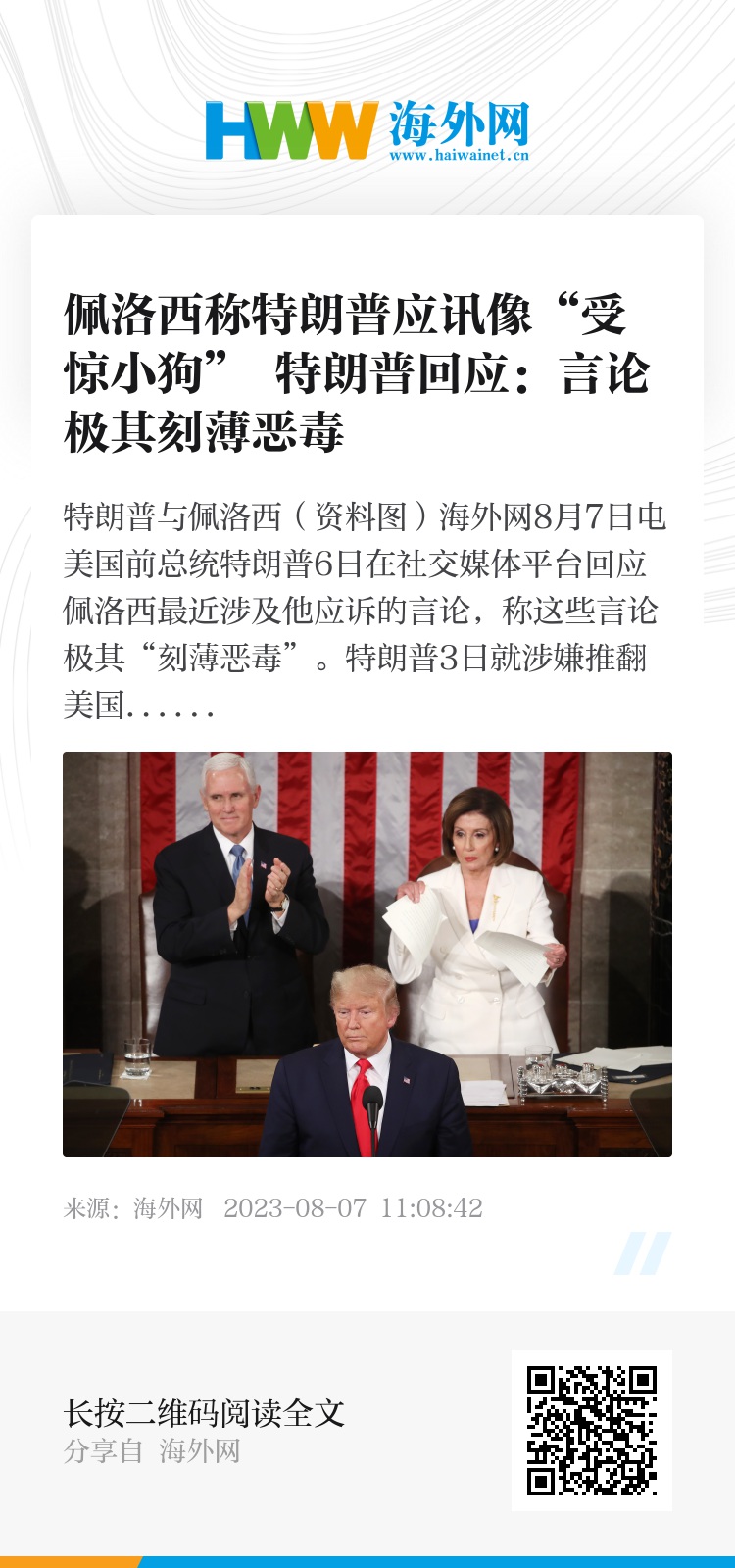 海外网8月7日电 美国前总统特朗普6日在社交媒体平台回应佩洛西最近涉及他应诉的言论,称这些言论极其“刻薄恶毒”。