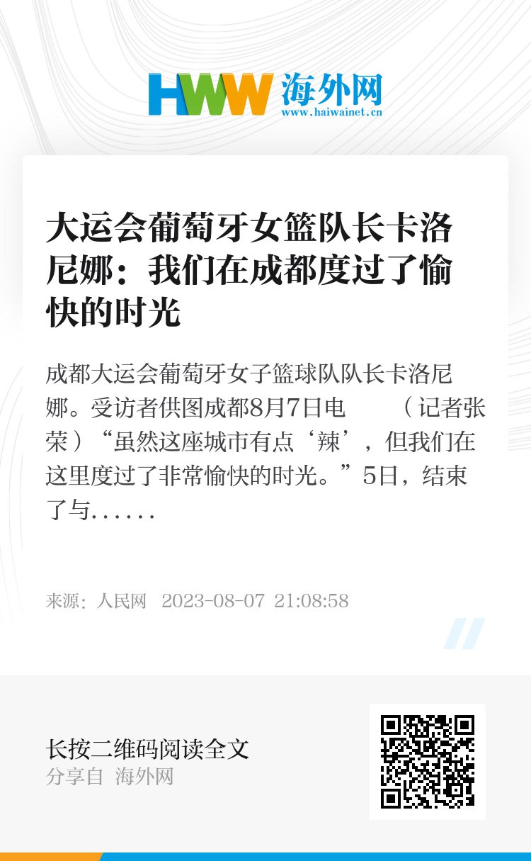 人民网成都8月7日电 (记者张荣)“虽然这座城市有点‘辣’,但我们在这里度过了非常愉快的时光。”5日,结束了与罗马尼亚队的比赛后,成都大运会葡萄牙女子篮球队队长卡洛尼娜·罗德里格斯接受了人民网记者的采访。