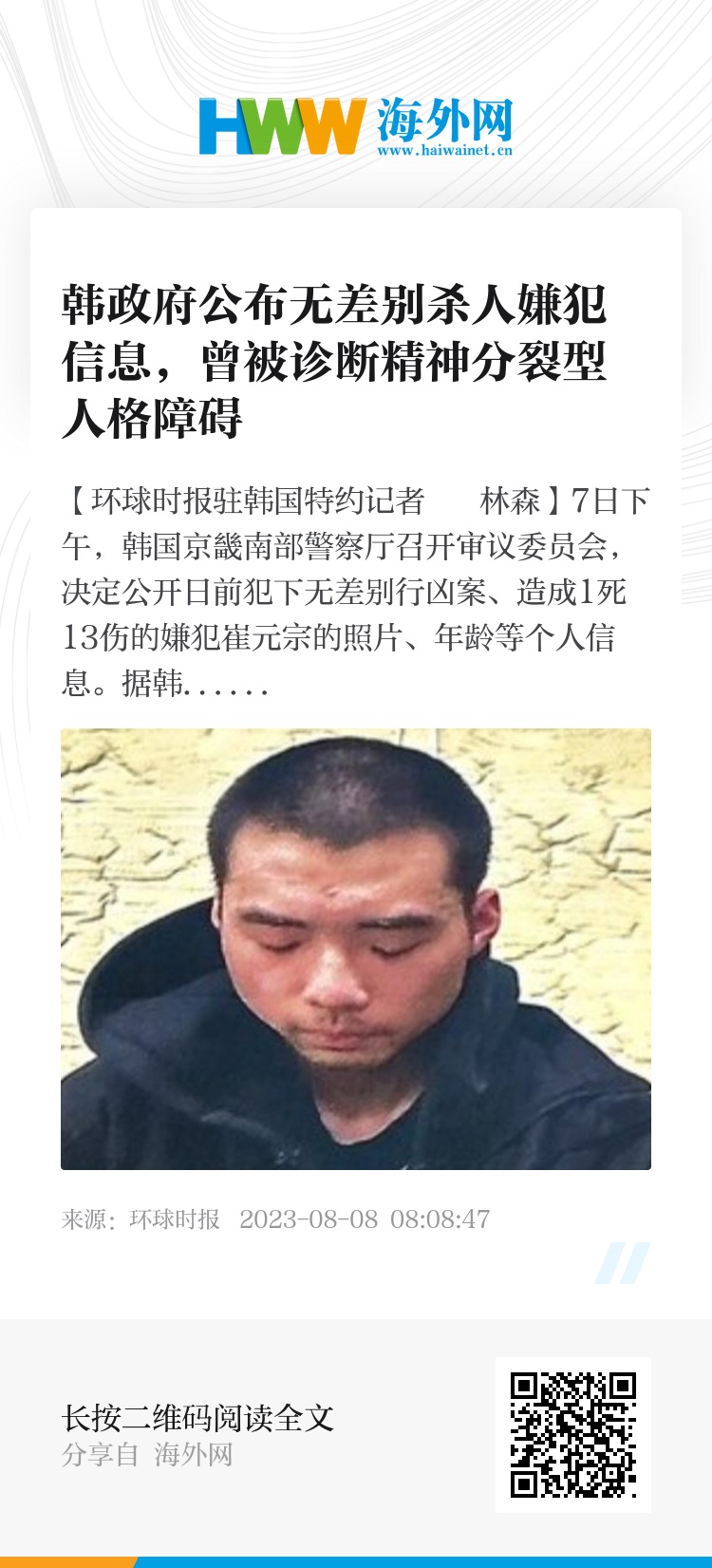 【环球时报驻韩国特约记者 林森】7日下午,韩国京畿南部警察厅召开审议委员会,决定公开日前犯下无差别行凶案、造成1死13伤的嫌犯崔元宗的照片、年龄等个人信息。据韩国《东亚日报》报道,其家人称,出生于2001年的崔元宗曾在中学三年级时参加奥林匹克竞赛并获奖,但他落榜名校高中后变得有些精神异常,在2020年被诊断为精神分裂型人格障碍,但未接受治疗。该案引发社会恐慌之余,还引起了“杀人预告”热潮。韩国警察厅国家搜查本部称,截至7日上午7时,已对网上的187条“杀人预告帖”进行立案侦查,59人落网,其中2人已经被立案,其中不满20岁者多达34人,占比高达57.6%。