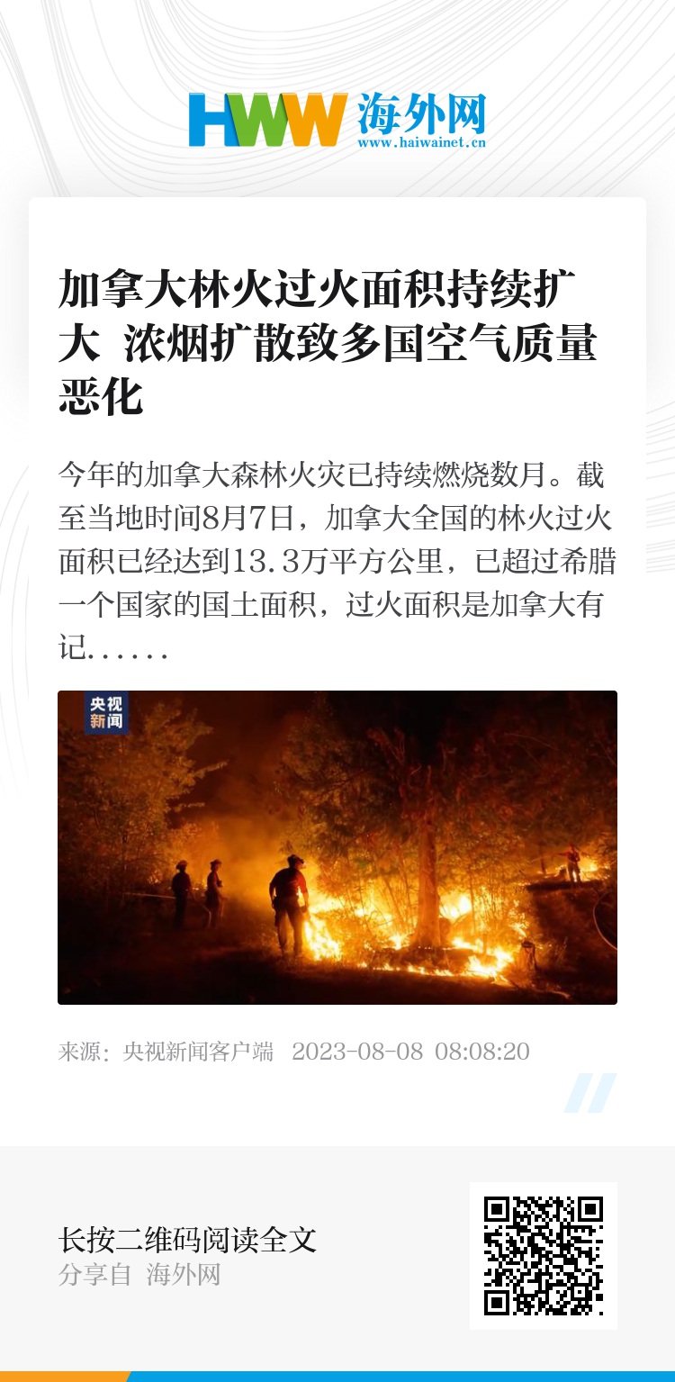 今年的加拿大森林火灾已持续燃烧数月。截至当地时间8月7日,加拿大全国的林火过火面积已经达到13.3万平方公里,已超过希腊一个国家的国土面积,过火面积是加拿大有记录以来最大的一年。其中,多数火场集中在加拿大西部,以不列颠哥伦比亚省最为严重。