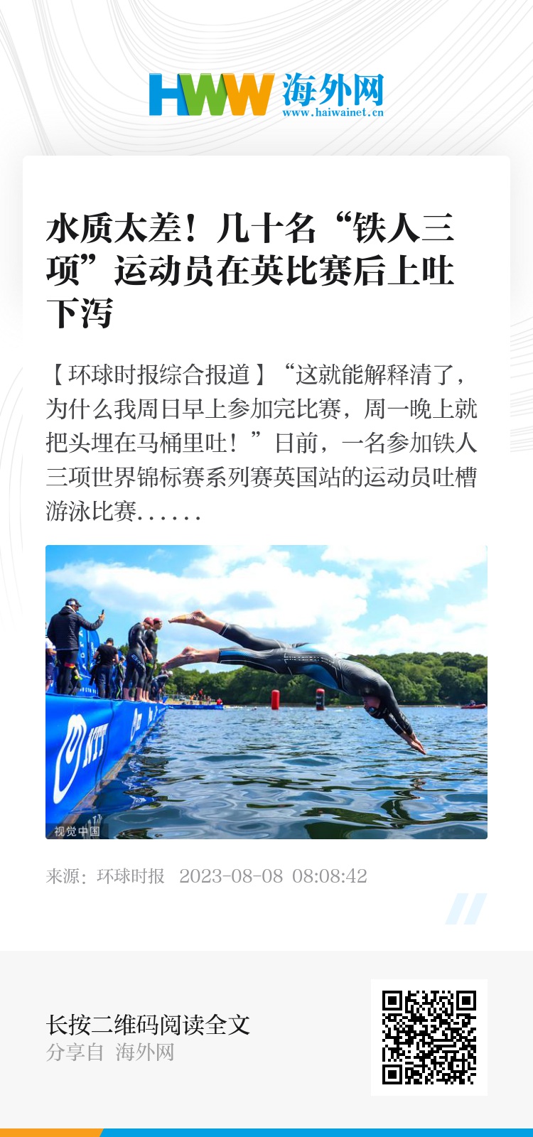 【环球时报综合报道】“这就能解释清了,为什么我周日早上参加完比赛,周一晚上就把头埋在马桶里吐!”日前,一名参加铁人三项世界锦标赛系列赛英国站的运动员吐槽游泳比赛场地的水质太差。
