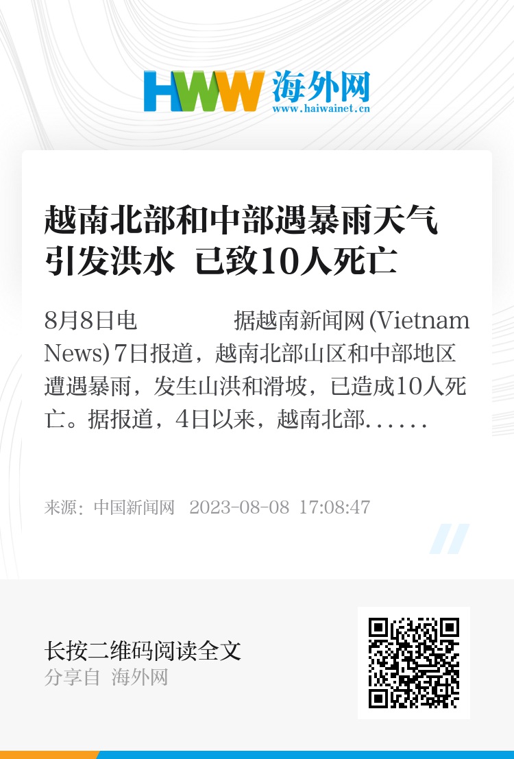 中新网8月8日电 据越南新闻网(Vietnam News)7日报道,越南北部山区和中部地区遭遇暴雨,发生山洪和滑坡,已造成10人死亡。