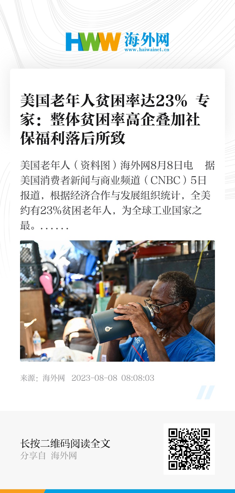 海外网8月8日电 据美国消费者新闻与商业频道(CNBC)5日报道,根据经济合作与发展组织统计,全美约有23%贫困老年人,为全球工业国家之最。专家表示要解决美国老年人贫困问题,就需要提高社会福利解决整体贫困。