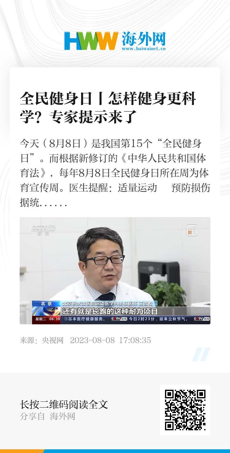 今天(8月8日)是我国第15个“全民健身日”。而根据新修订的《中华人民共和国体育法》,每年8月8日全民健身日所在周为体育宣传周。