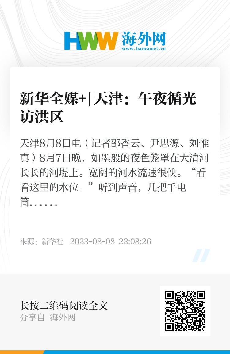 新华社天津8月8日电(记者邵香云、尹思源、刘惟真)8月7日晚,如墨般的夜色笼罩在大清河长长的河堤上。宽阔的河水流速很快。“看看这里的水位。”听到声音,几把手电筒不约而同伸了过来。