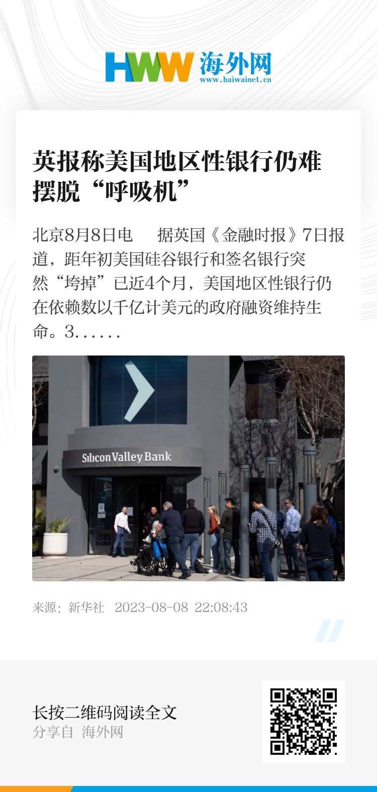 新华社北京8月8日电 据英国《金融时报》7日报道,距年初美国硅谷银行和签名银行突然“垮掉”已近4个月,美国地区性银行仍在依赖数以千亿计美元的政府融资维持生命。