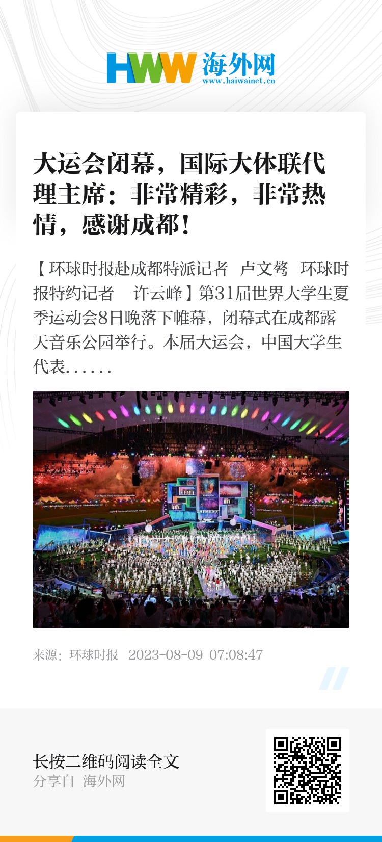 美通社日前以“用青春活力让世界变得更美好”为题撰文称,自成都大运会开幕以来,大运村中随处可见不同肤色、不同民族和不同语言的大学生运动员,大运会期间他们相识相知。成都让梦想成真,成为全球青年体育与梦想的交汇之地,“成都大运会已成为一届具有中国特色、时代精神和青年风采的国际体育盛会”。