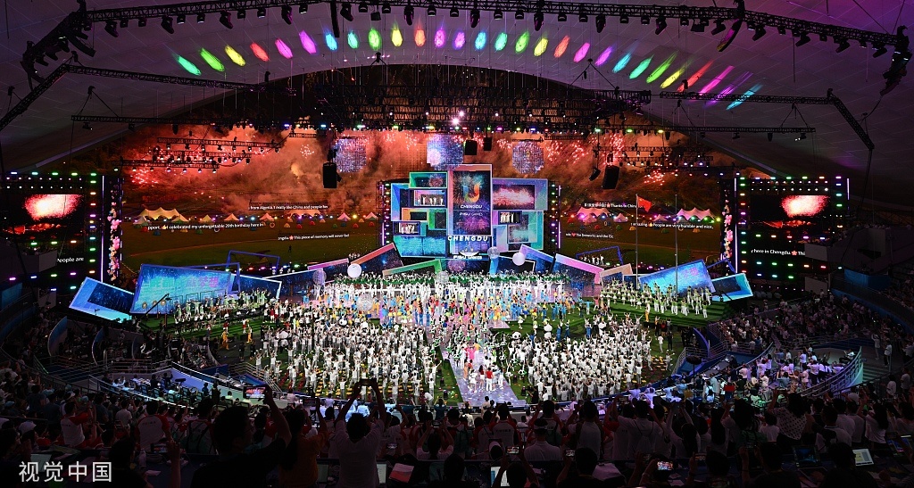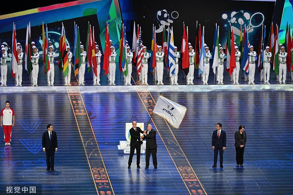 2023年8月8日,在成都大运会闭幕式上,会旗交接仪式举行。(视觉中国)