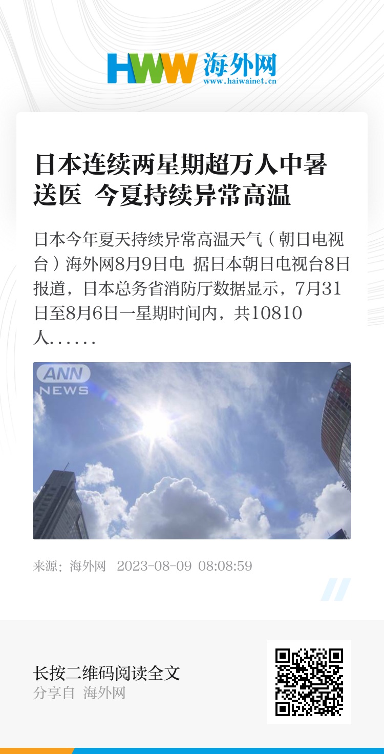 海外网8月9日电 据日本朝日电视台8日报道,日本总务省消防厅数据显示,7月31日至8月6日一星期时间内,共10810人因中暑被紧急送医,日本已连续两星期中暑送医人数超万人。