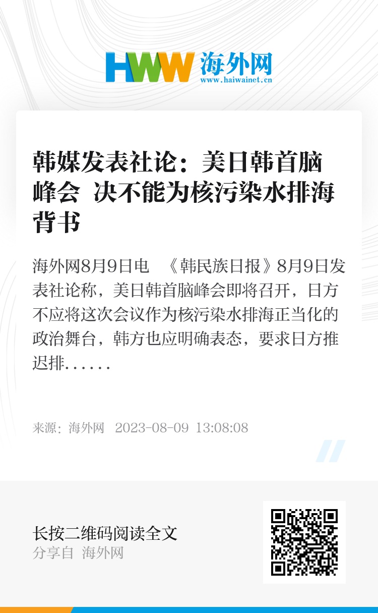 海外网8月9日电 《韩民族日报》8月9日发表社论称,美日韩首脑峰会即将召开,日方不应将这次会议作为核污染水排海正当化的政治舞台,韩方也应明确表态,要求日方推迟排海计划。