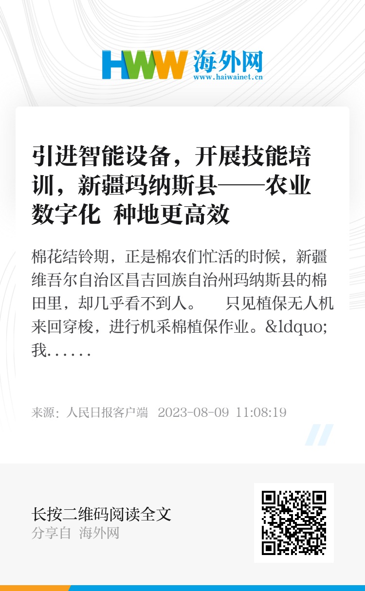 只见植保无人机来回穿梭,进行机采棉植保作业。“我们用的是北斗导航自主作业,精准便捷,效率还高,一架无人机每天可以完成500亩地的作业量。”玛纳斯县乐土驿镇上庄子村种植大户宋国林种了2500多亩棉花,却只需要隔几天去地里看看长势。村里的农机专业合作社,25台大马力拖拉机全部配备了卫星导航无人驾驶系统以及新式精量播种机、智能打药机等新型设备。“从种到收都是机械化,我不用操太多心。”宋国林说。