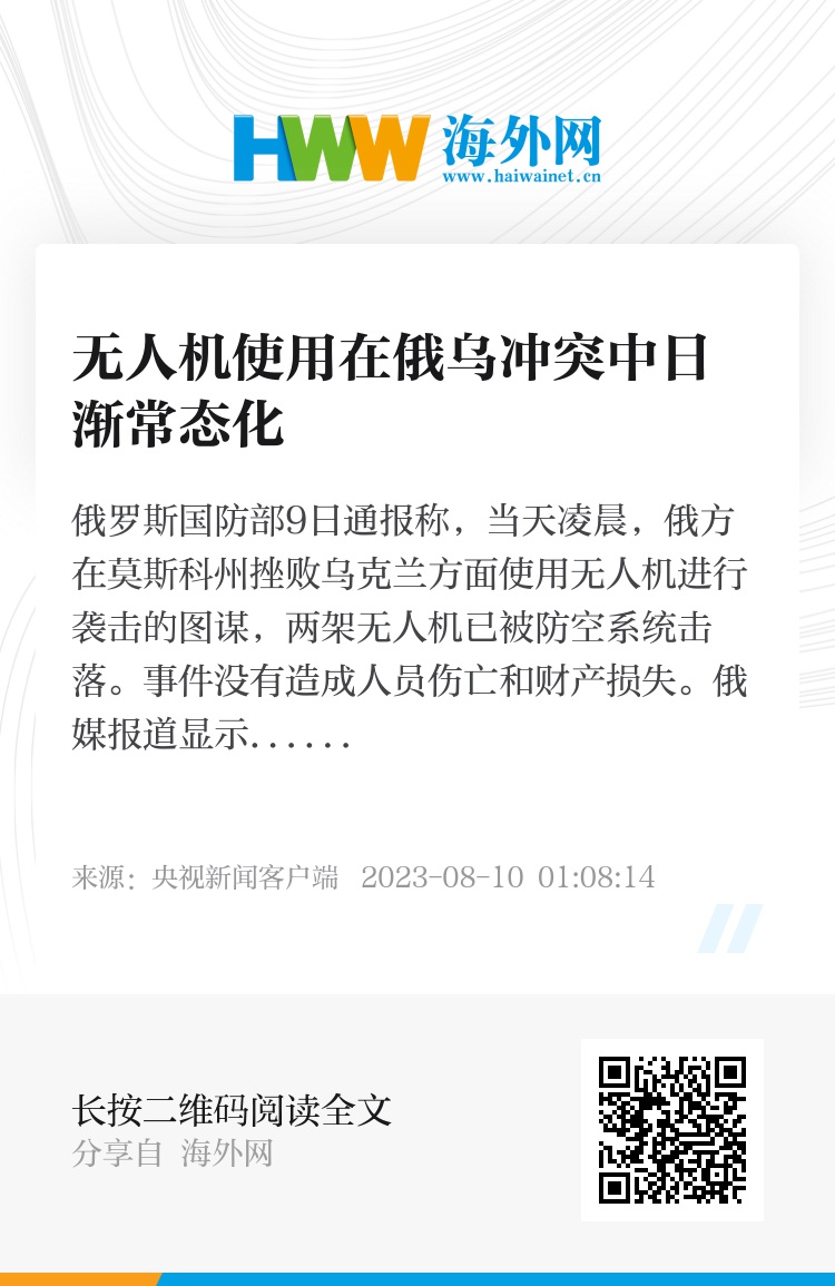 俄罗斯国防部9日通报称,当天凌晨,俄方在莫斯科州挫败乌克兰方面使用无人机进行袭击的图谋,两架无人机已被防空系统击落。事件没有造成人员伤亡和财产损失。俄媒报道显示,俄罗斯近期频遭无人机袭击。俄方也在增强自身的无人机作战能力。专家指出,无人机袭击在俄乌冲突中可能会更加频繁。